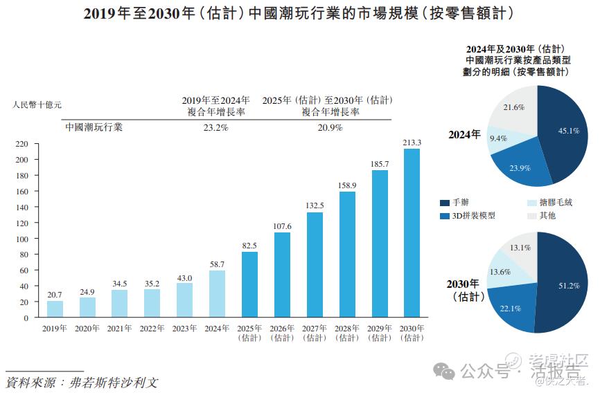 根据弗若斯特沙利文(Frost & Sullivan)的报告,中国潮玩行业呈现快速增长态势,零售额由2019年的人民币207亿元跃升至2024年的人民币587亿元,实现23.2%的强劲复合年增长率。该行业预计将由2025年的人民币825亿元增长至2030年的人民币2,133亿元,实现20.9%的复合年增长率。