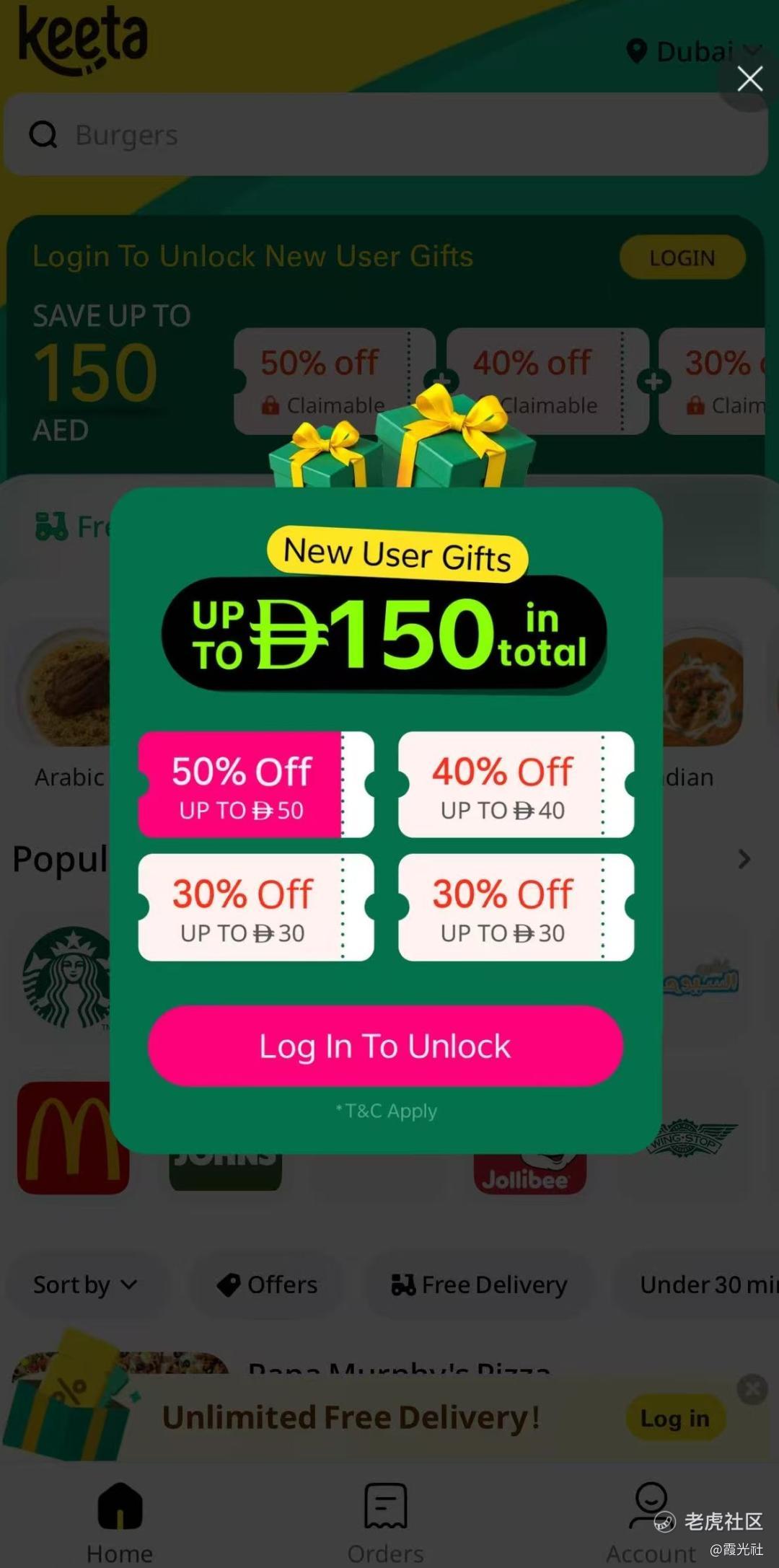Keeta在迪拜,最高优惠可达150迪拉姆(约合291.34元人民币) 图片来源:App截图