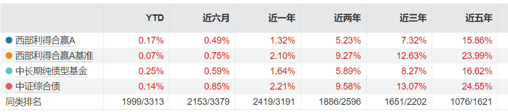 以最新规模20.68亿元(截至2025.6.30)的西部利得合赢债券A为例,这只基金的净值增长率,近五年、近三年、近一年、近六月,全都跑输业绩基准以及中证综合债平均值。