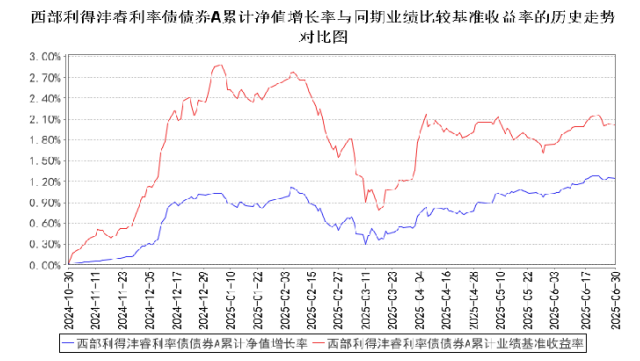基金中报显示,自基金合同生效以来,截至2025.6.30,西部利得沣睿利率债债券A的净值增长率为1.25%,同期业绩基准为2.01%,因此,这只基金跑输基准0.76%。