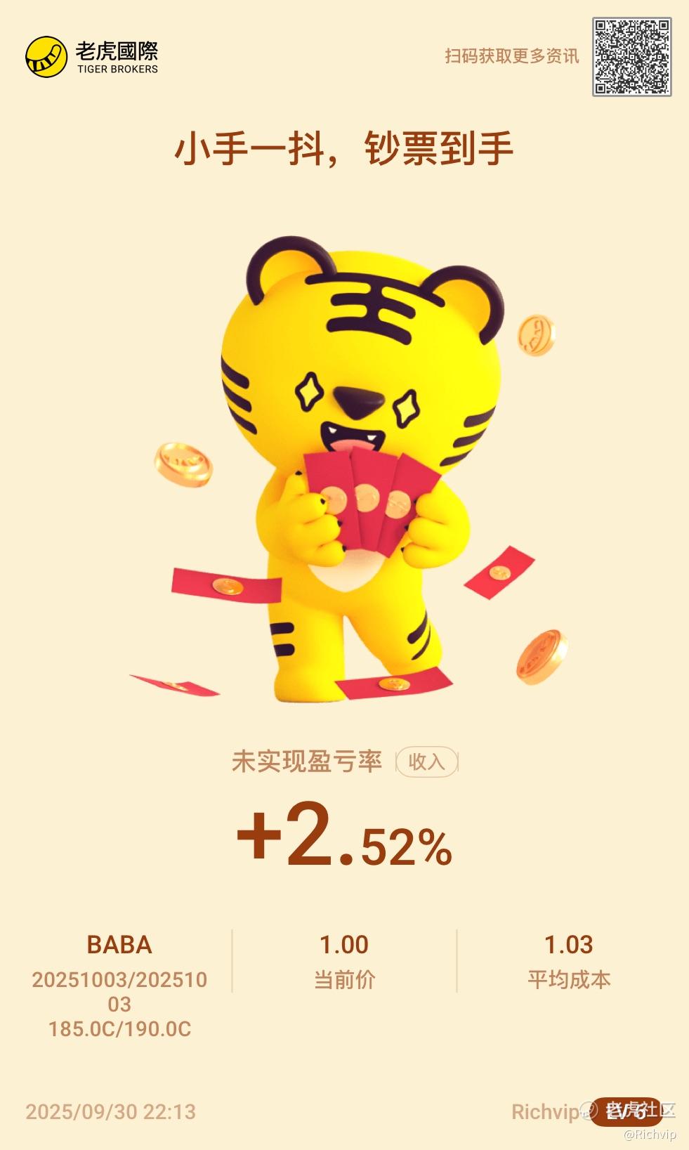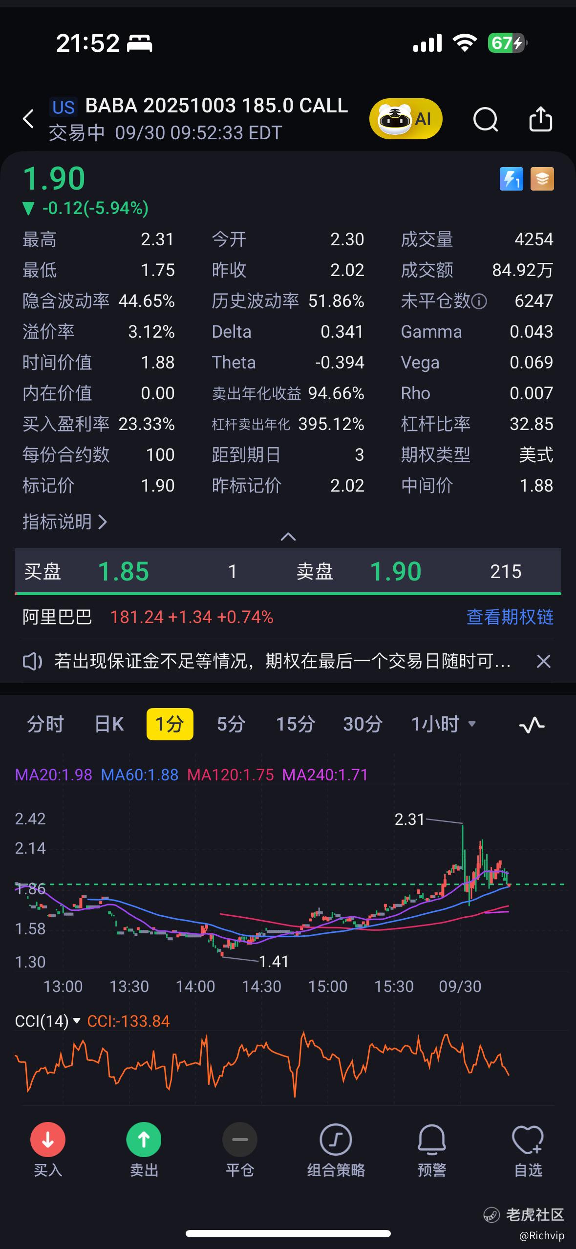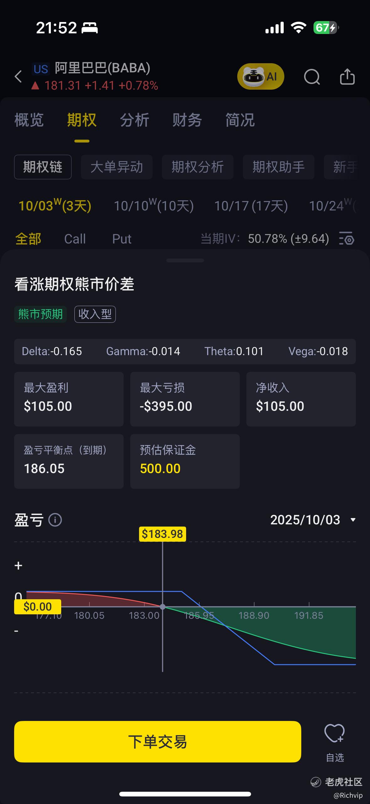 $阿里巴巴 垂直价差 251003 CALL 190.0/CALL 185.0$ 短期利好IV值高溢价,高位用期权做空阿里巴巴!