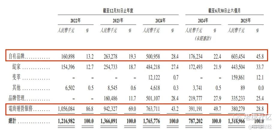 转折发生在上市同年,若羽臣启动战略转型,从"渠道服务商"向"品牌平台"升级,打造自有品牌作为第二增长曲线。历经五年探索,转型成效已清晰显现。2025年上半年,其自有品牌实现营收6.03亿元,同比激增242.42%,收入占比提升至45.8%,首次超越传统代运营业务,成为核心增长引擎。