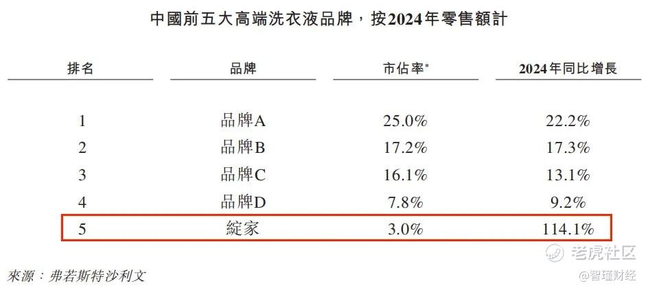 以其王牌产品高端洗衣液为例,消费者在追求功能性表现的同时,日益追求情绪价值及身份认同,故高端洗衣液(即每1000毫升定价人民币50元或以上的洗衣液)成为快速发展的细分市场。2024年,按零售额计,在中国高端洗衣液细分市场中,绽家排名第五。