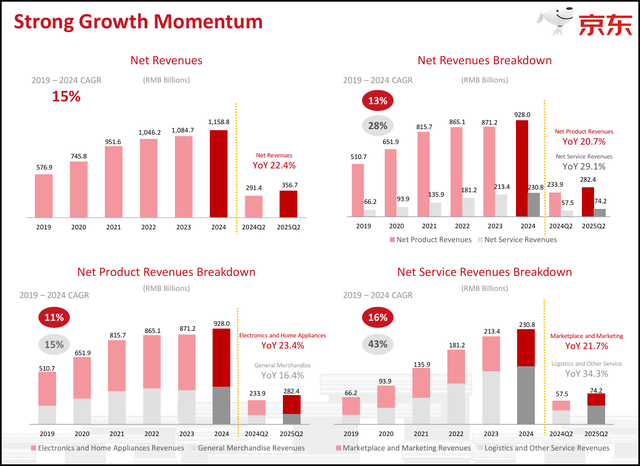 下图:第二季度,京东继续强劲增长,净收入大幅增长 ~22.4%(产品收入同比增长 20.7%,服务收入同比增长 29.1%