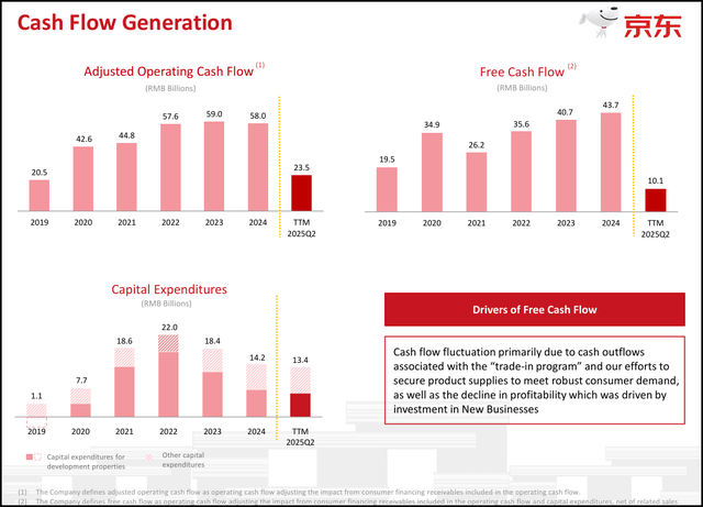 下图:京东当前强劲的营收增长和核心现金流能力,正被战略性的巨额投入所压制,导致其近期可分配给股东的自由现金流非常稀薄。
