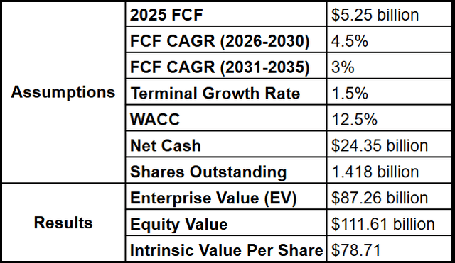 首先是折现现金流模型(DCF),假设自由现金流为52.5亿美元,未来五年复合增长率4.5%,随后五年3%,加权平均资本成本(WACC)12.5%,终端增长率1.5%,得出目标价约78.71美元/股。
