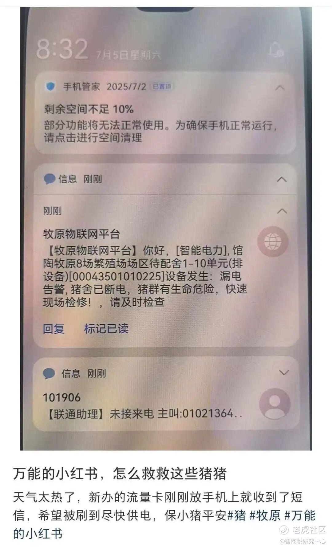 一位用户办了新流量卡后,由于原机主的短信提醒未撤销,因此她在阴差阳错之间,收到了牧原物联网平台,有关猪舍停电的信息。