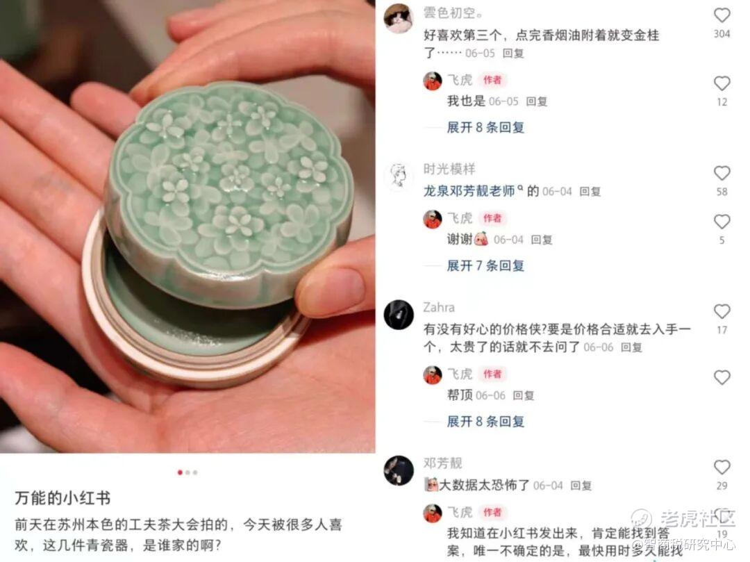 小红书用户“飞虎”在苏州一场功夫茶大会上,觉得几件青瓷器十分精美,于是拍照发到小红书上,询问这是谁家的作品。