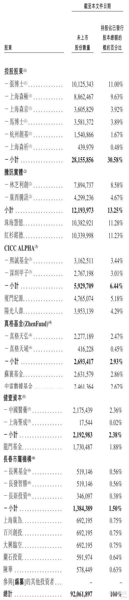 腾讯通过林芝利创持股8.58%,通过广西腾讯持股4.67%,共持股为13.25%;珠海慧亿持股11.28%,红杉铭德持股11.23%,CICC ALPHA通过熙诚基金持股3.44%,通过深圳甲子持股为3.01%,一共持股为6.44%。