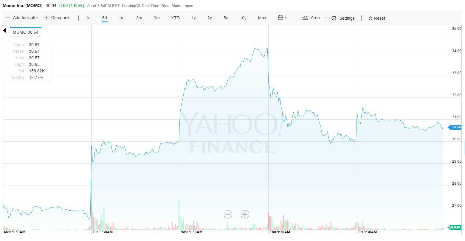 Momo (NASDAQ: MOMO): Q4 EPS of $0.44 beats by $0.14 and Revenue of $246.12M beats by $54.43M. 陌陌第四季度营收高于预期,受益于手游,视频直播和移动营销服务需求,股价周二上涨12.74%,收盘价30.00美元。周三股价继续飙升,涨幅13.97%,收盘价34.19美元,创下历史新高。