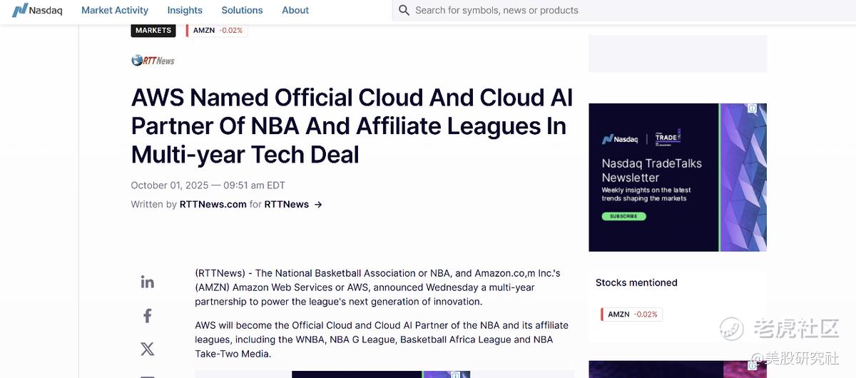当市场还在纠结于云基础设施的季度增长率时,亚马逊 (NASDAQ: AMZN) 已经悄然为旗下的亚马逊云科技业务找到了一个新的、极具想象力的增长引擎——体育竞技。就在昨晚,纳斯达克官网消息,NBA宣布与亚马逊云科技达成多年合作伙伴关系,共同推动NBA的下一代创新。