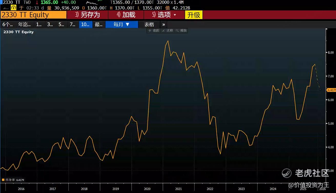 从估值上看,台积电的市净率依然没有超过2021年,还有上涨空间: