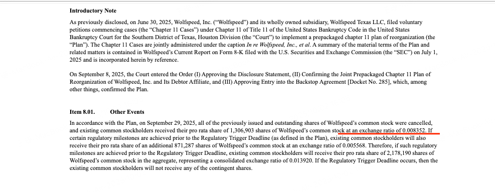 - 2025 年 9 月 29 日,Wolfspeed 公告执行重组方案,注销所有现有普通股并将其兑换为新股。