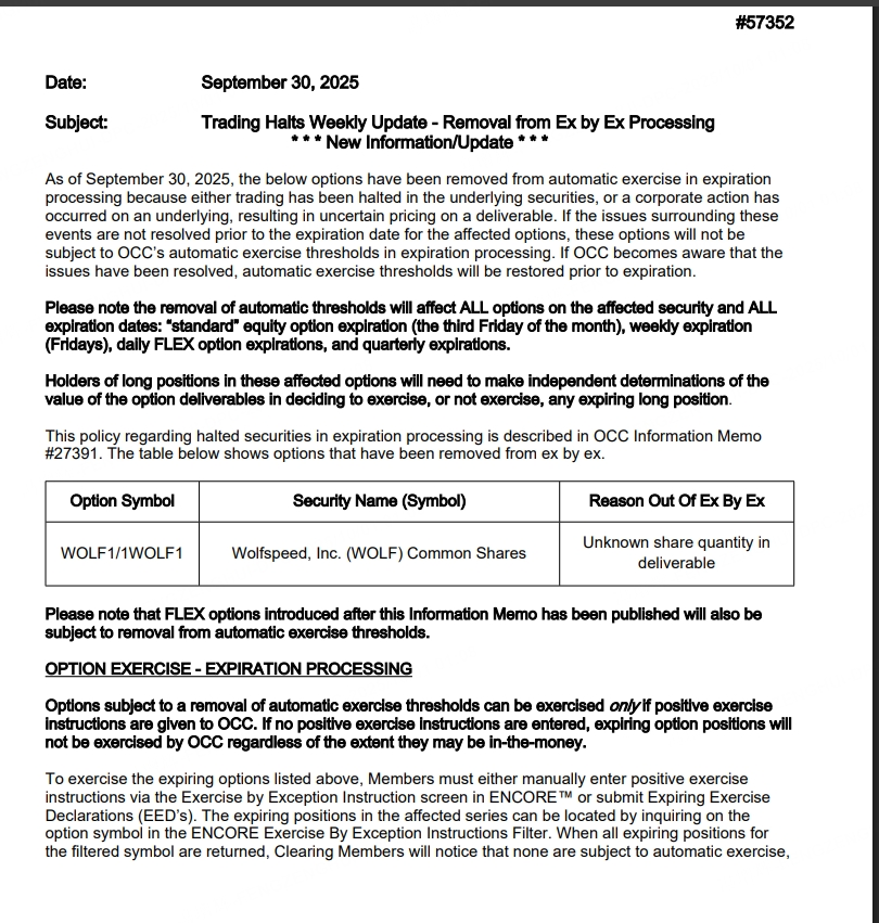 - 2025 年 9 月 30 日,OCC 发布 57352 号公告。由于 WOLF1 期权所对应的标的证券涉及公司行动,当前可交割证券的定价尚未确定。OCC 临时取消了该期权到期后的自动行权机制。