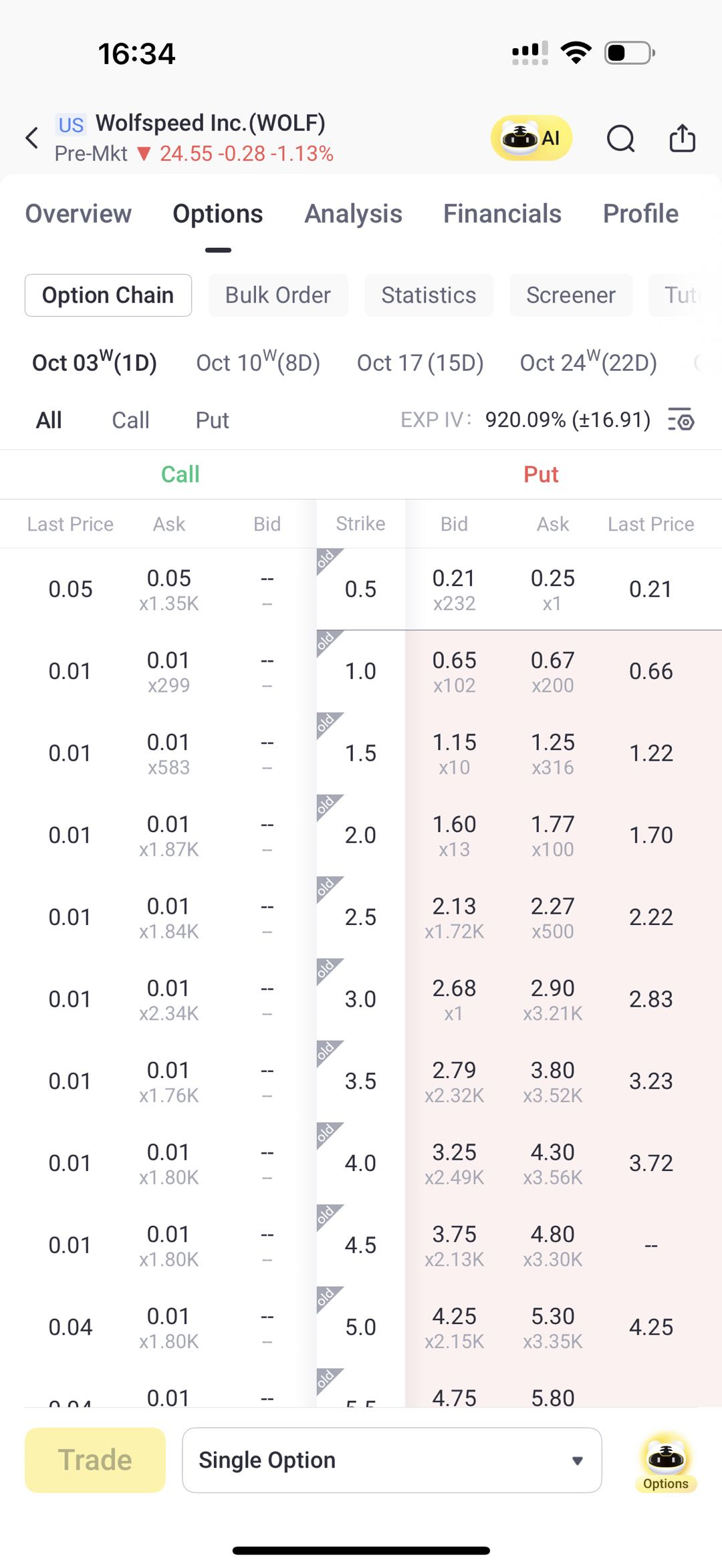- APP 期权页面可见的,价内/价外的显示,是基于 「WOLF正股最新价格 * 0.008352」来判断的,0.008352 就是 WOLF 本次合股的比例系数。