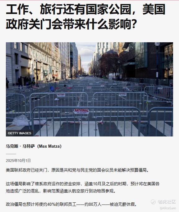 美 国 政 府 “停摆”了,关门了,大家能想象到吗,一个庞大的国家,地球村最大的地主之一,因国 会 参 议院 否决 临时拨款法案,美 国 联 邦 政 府 自 2025年10月 1 日 起就直接进入“停摆” 模式。[惊讶] 因为这个 政 府 “关门” 带来的影响,据说有大约75万名 联 邦 雇 员 被迫 停 薪 休假,还有多项 公 共 服 务 陷入停滞,还有国家公园、以及航空系统,也都受到了冲击 [捂脸]