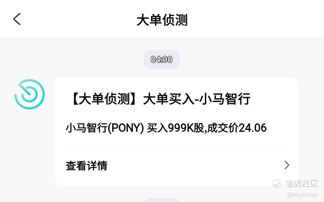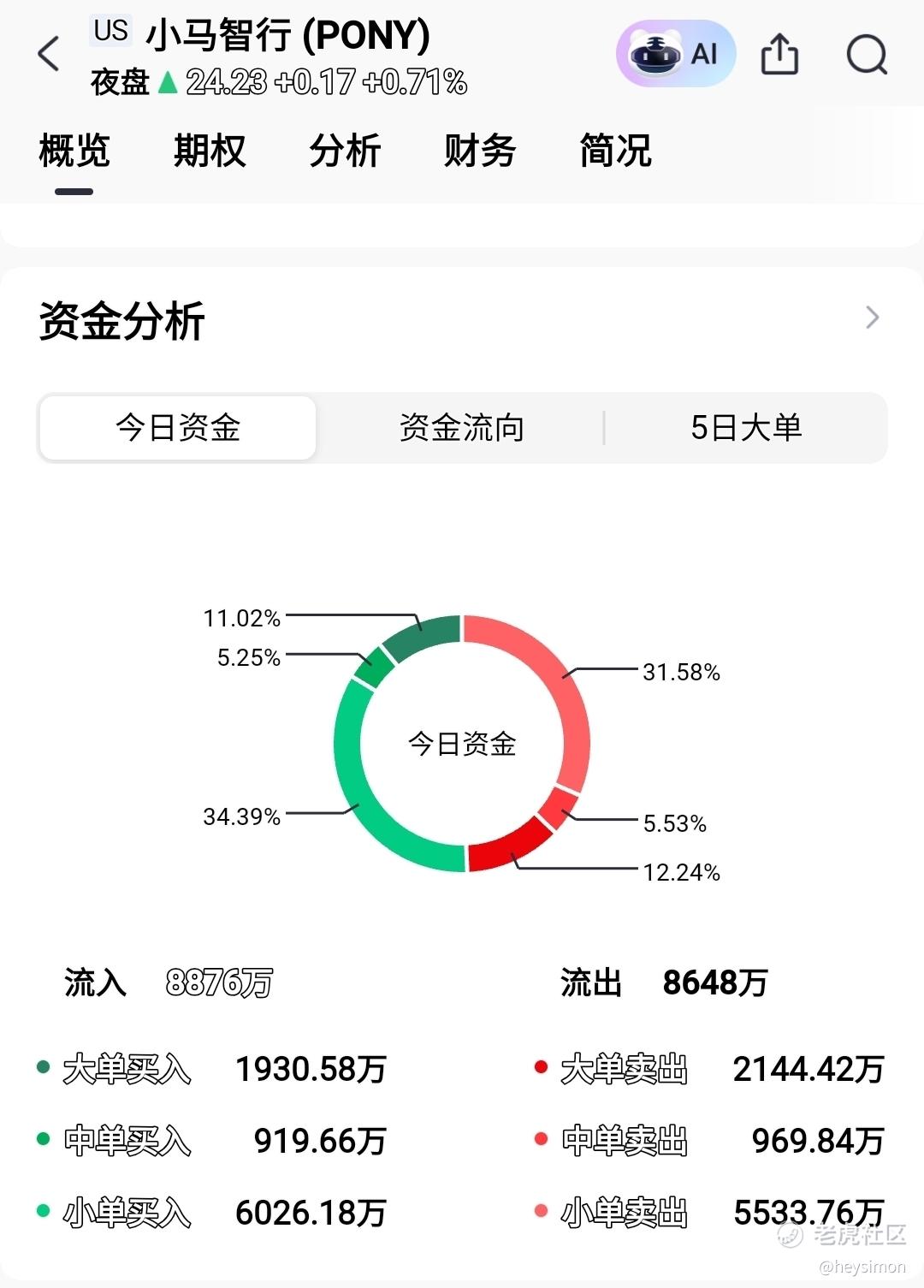 $小马智行(PONY)$ 老虎的数据自己有矛盾,大单侦测尾盘999K 大单买入,单价24.06,那就是 999000×24.06=24035940 就是2400万,他自己的今日资金显示大单买入才1930万。 这数字还能出错?还是什么原因?有没有高人解答一下