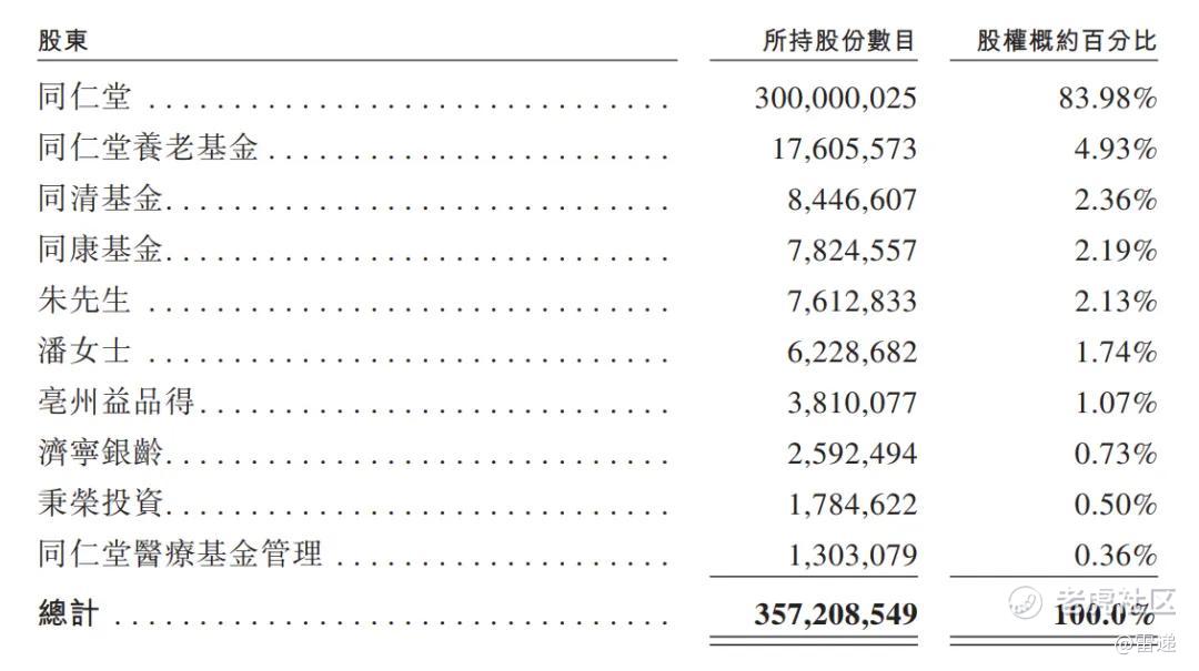 其中,同仁堂持股为83.98%,同仁堂养老基金持股为4.93%,同康基金持股为2.19%,同仁堂医疗基金管理持股为0.36%,同清基金持股为2.36%,朱先生持股为2.13%,潘女士持股为1.74%,亳州益品得持股为1.07%,济宁银龄持股为0.73%,秉荣投资持股为0.5%。