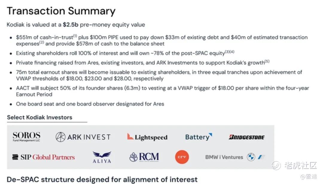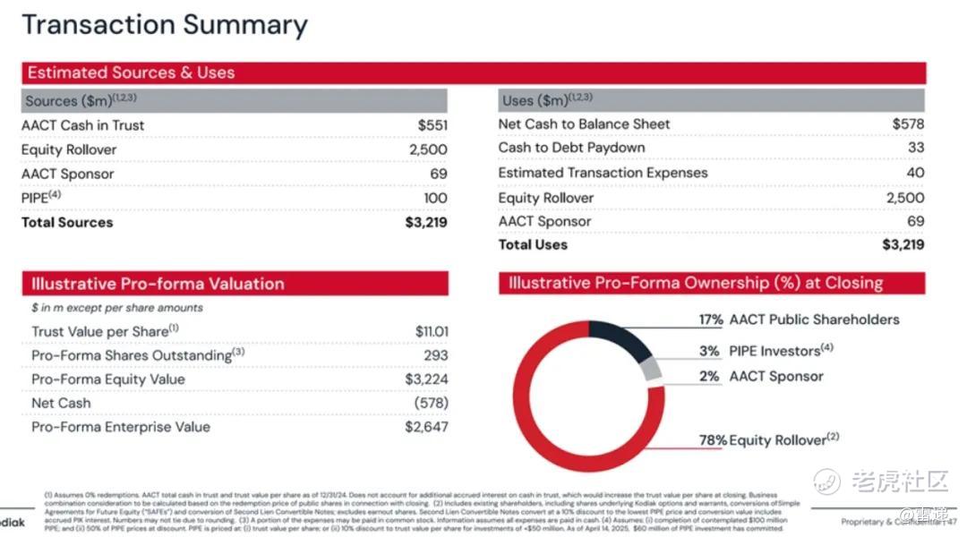 交易后,新公司名称为Kodiak AI,Equity Rollover持股为78%,AACT Public股东持股17%,PIPE股东持股3%,AACT Sponsor持股为2%。