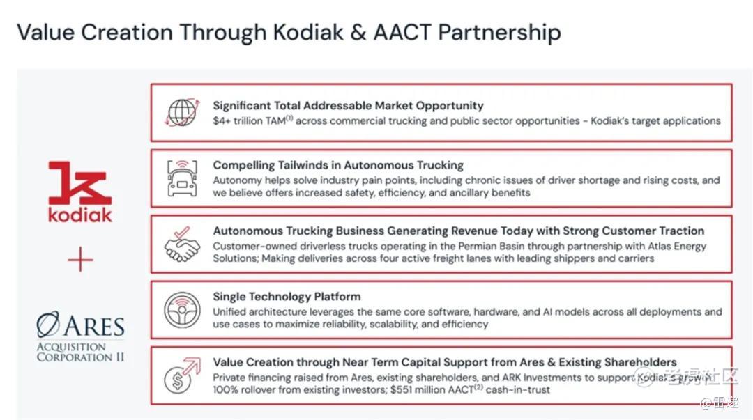 Kodiak创始人兼首席执行官Don Burnette表示, “随着我们与AACT的拟议业务合并以及Kodiak上市推进,我们整个团队将继续专注于执行我们的战略,以扩大业务规模并加速增长。我们期待引领商用卡车运输和公共部门行业的发展,并抓住未来激动人心的价值创造机遇,造福客户和股东。”