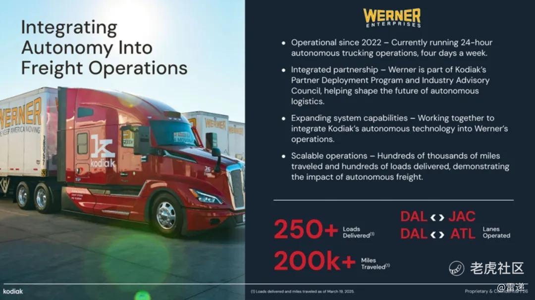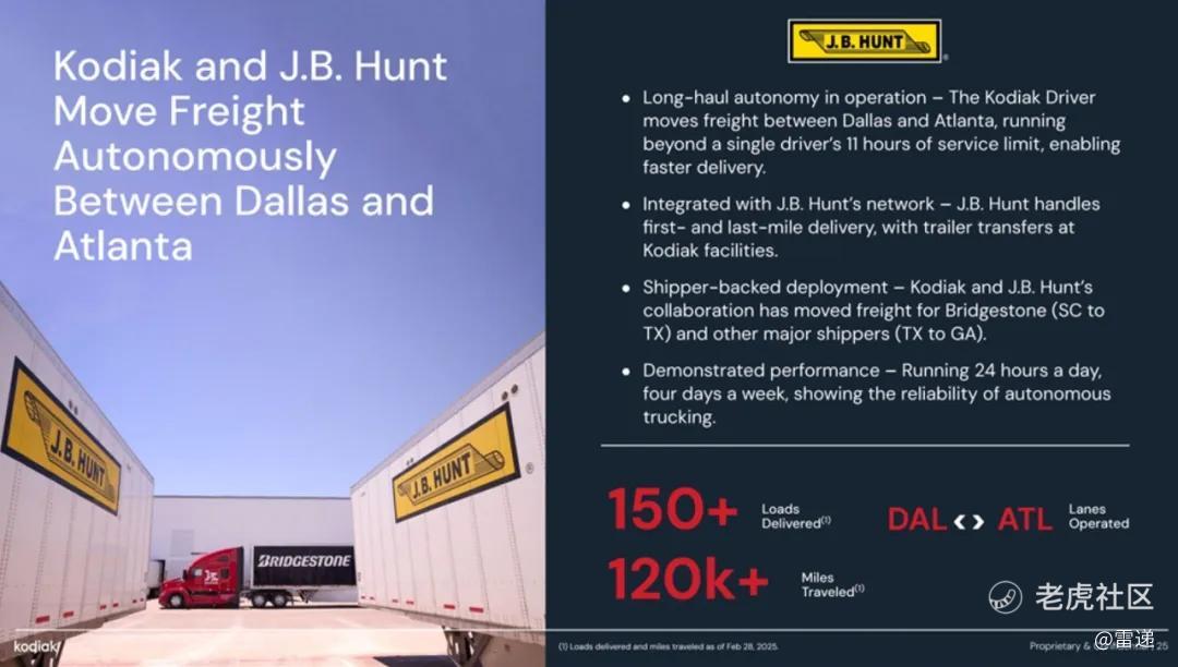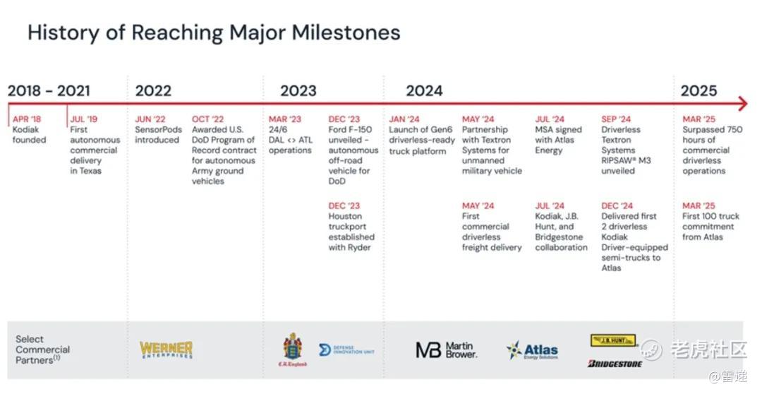 2025年1月,Kodiak向客户Atlas Energy Solutions交付了首批两辆自动驾驶卡车,标志着其首次商业化运营。Atlas已承诺购买首批100辆卡车,以协助其在西德克萨斯州偏远的二叠纪盆地运输压裂砂。