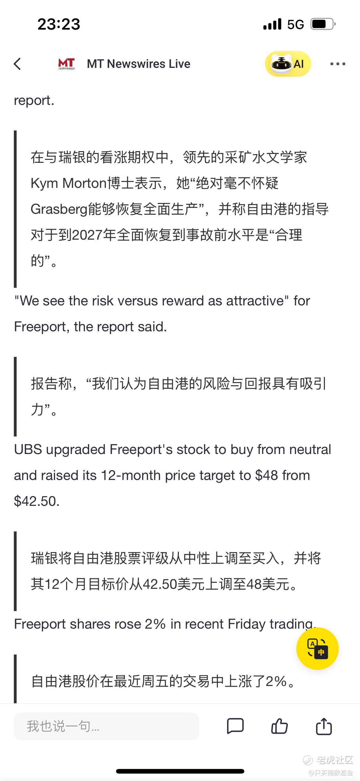 机构对FCX目标价上调为48美元,认为矿难并没有对公司基本面发生重大变化,反而可以在铜价涨高后收益增加