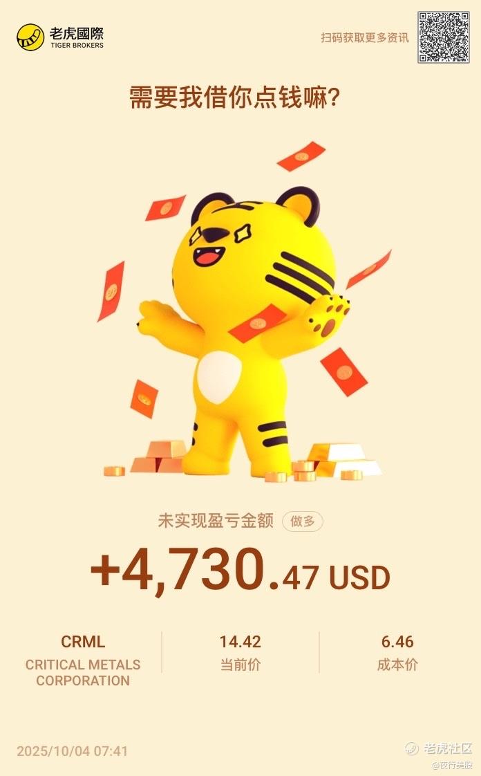 $CRITICAL METALS CORPORATION(CRML)$ CRML顺利翻倍110%,不妄费在老虎从7月开始2美元的时候一直发帖叫到现在(可以查看老虎里CRML的发帖记录),恭喜各位虎友和群友!