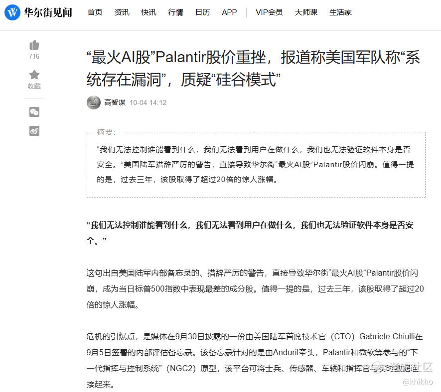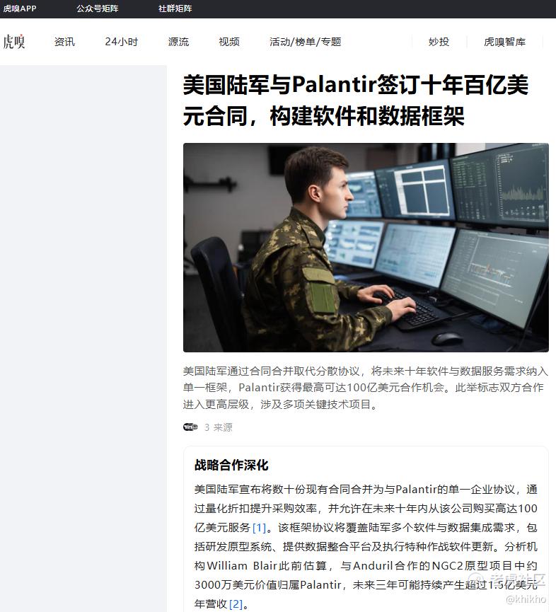 原来是美军内部备忘录指出Palantir 与 Anduril 合作开发的次世代战场指挥系统NGC2存在“非常高风险”的安全漏洞,包括用户权限无法控制,无法验证软件安全性,第三方应用未经审查,存在高危漏洞。这则新闻对Palantir股票的影响,我们可以从以下几个维度来分析:
