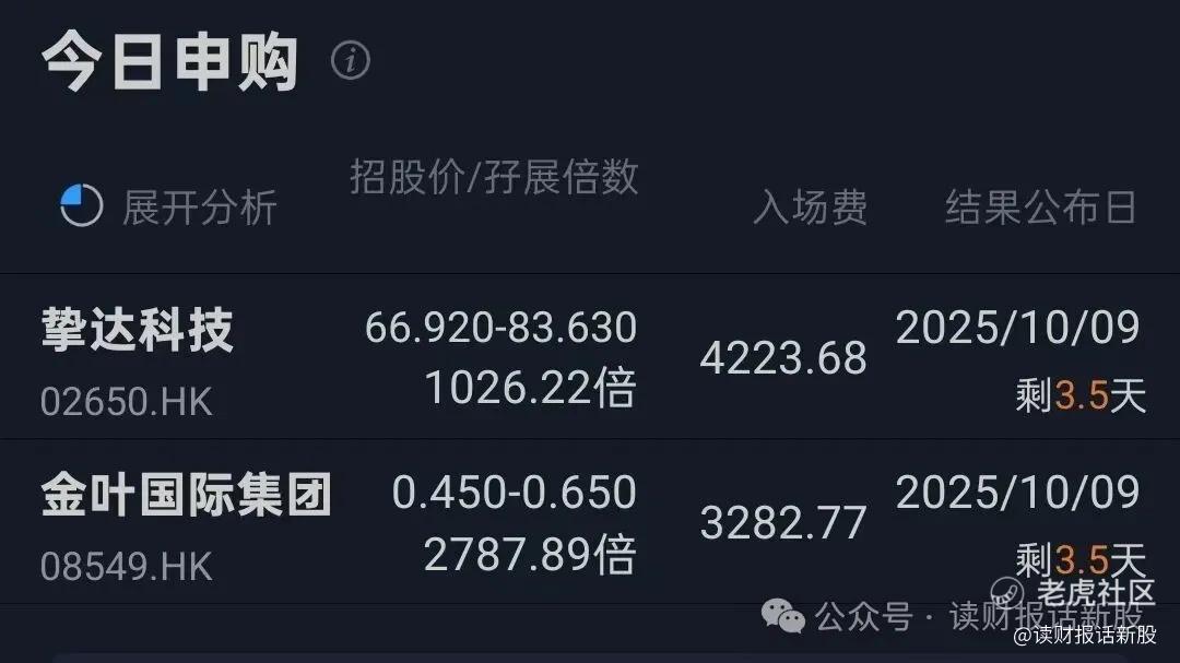 目前正在招股的金叶国际集团 $金叶国际集团(08549)$ 、挚达科技 $挚达科技(02650)$ ,软件显示超购倍数如下