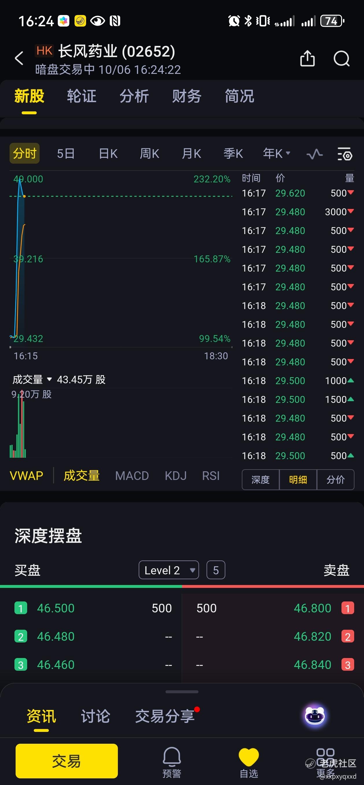长风药业单计孖展认购,已经成为超购倍数第三高的新股,仅次于 $大行科工 (02543.HK)$ 的7557倍, $布鲁可 (00325.HK)$ 的6000倍,优于 $银诺医药-B (02591.HK)$ 的5341倍。公司将于10月6日16:15-18:30开启暗盘,10月8日正式上市。【大家看好节后新股上市吗?】