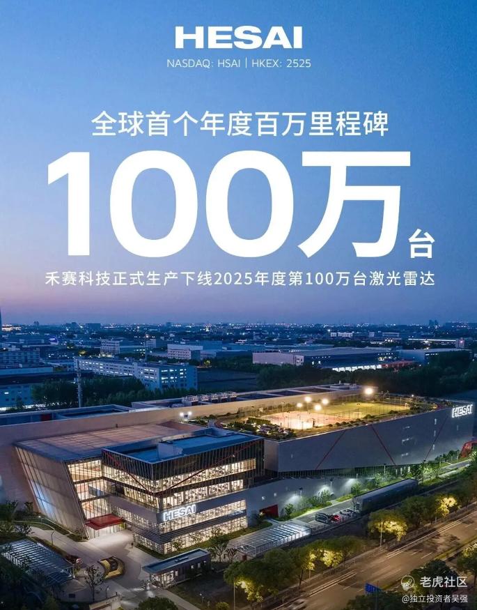 禾赛科技宣布其年度第100万台激光雷达已于9月底正式下线,也因此成为全球首个年产过百万的激光雷达企业,这同行业咋比