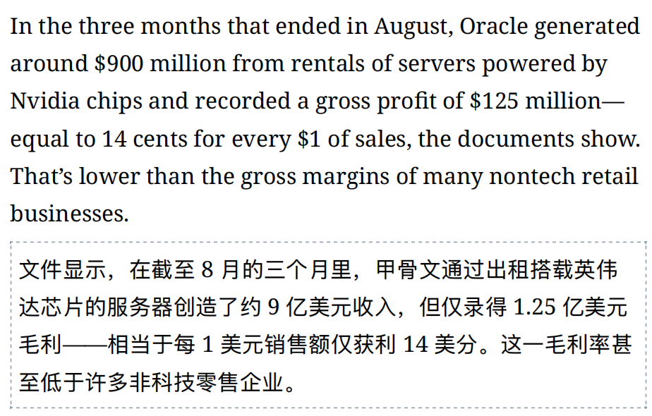 昨晚,美股科技股纷纷下跌,起因是The information的一篇文章称,甲骨文过去几个月出租英伟达芯片服务器录得1亿美元亏损,毛利率也仅有1/7。