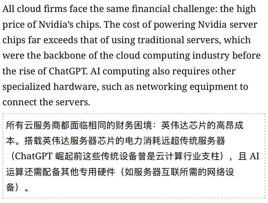 尽管报道称,这似乎还和出租较旧的芯片——比如A100,H200的折旧成本高有关,但这揭示了一直以来的一个困境:AI链条上,英伟达和台积电等硬件盆满钵满,大型科技公司的云和广告算法也有所回报,但其他硬件厂,比如小型云服务商等,以及真正的AI应用,比如LLM等,都仍面临亏损和现金不足的情况。
