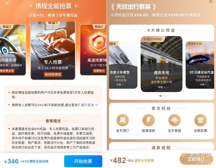 在携程、去哪儿、飞猪等平台上,“加速包”已经被包装成“全能抢票”“放心抢票”等套餐售卖,价格从40元至60元不等。