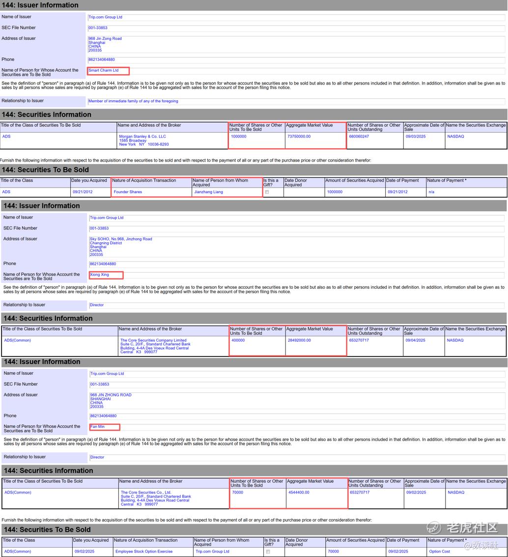 根据9月初携程递交美国SEC的文件,董事局主席梁建章计划出售100万股美国存托股份(ADS),套现约5.27亿元(人民币,下同);联合创始人兼总裁范敏计划减持7万股ADS,套现约3242万元。