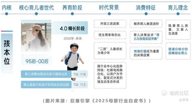 巨量引擎《2025母婴行业白皮书》指出:从“粗放喂养”到“精细养育”再到“分龄精长”,中国母婴消费市场正在迈入以“孩本位”为核心的4.0精长阶段。“既要育儿质量,又要人生进度”是95后-00后新生代父母的根本育儿理念,而“情绪价值”成为了育儿消费的重要决策因素。