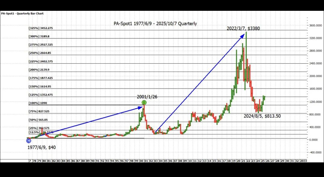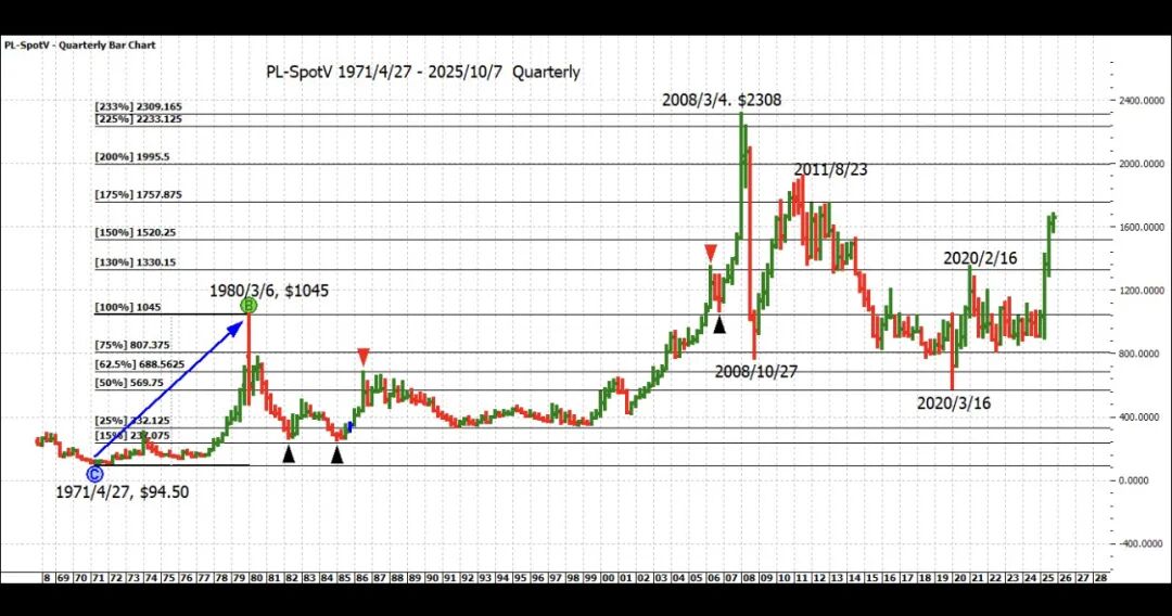 →今天$1356。昨天刚突破2025/7/18的周线图高点。同时,季线图突破了125%阻力位。