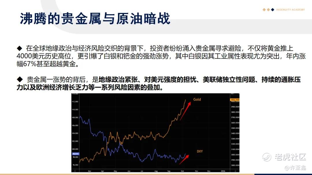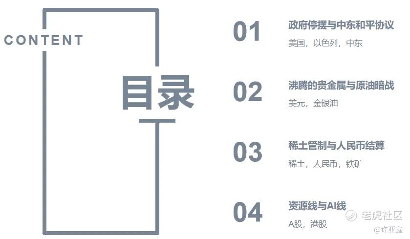 晚上的直播课,我分别从“政府停摆与中东和平协议”,“沸腾的贵金属与原油暗战”,“稀土管制与人民币结算”,“资源线与AI线”四个方面解读了基本面的一些信息,并结合美国,以色列,中东,美元,金银油,稀土,人民币,铁矿,A股,港股等给出了接下来的布局思路。