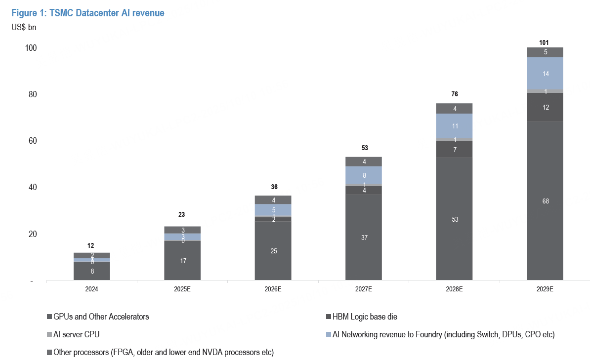 仅数据中心AI一项?投行预测至2029年复合年增长率达53%(2024年130亿美元,增至2029年1240亿美元),涵盖GPU(英伟达/客制化芯片)、HBM基底、伺服器CPU、网络设备(交换器/DPU)等。超大规模云商如OpenAI与Oracle正为2026年算力大开绿灯;CoWoS产能扩增60%,受益 $博通(AVGO)$ /英伟达/ $美国超微公司(AMD)$ 订单。更关键的是,瓶颈转向3纳米,因Rubin芯片弃用CoWoS转而采用翻转芯片——台积电借机强势提价。