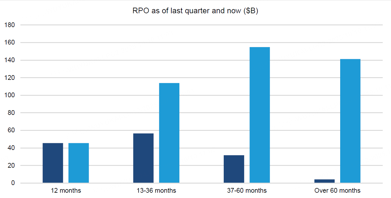 Oracle的云业务正加速演变。过去一年,公司从去年10月的长期指引起步,逐步披露多项巨额AI合同:6月30日的8-K备案显示,多笔大单将从FY28起贡献超300亿美元云收入;9月9日Q1财报则给出OCI五年指引——FY26达18B、FY27 32B、FY28 73B、FY29 114B、FY30 144B美元,年复合增速超70%。RPO(剩余履约义务)环比暴增317B美元,其中140B将在五年后确认,显示合同时效长、现金流潜力大。