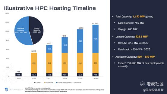 此外,TeraWulf旗下的Cayuga矿场通过三期建设,电力规模可扩展至400兆瓦。总体来看,该公司计划到2030年实现1150兆瓦的总电力规模。
