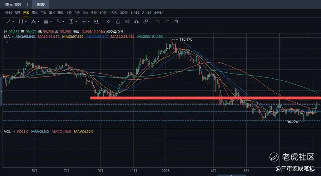 所以,后面市场最重要的指标之一就是美元指数:目前的美元指数已经涨到了一个重要的压力位置,如果突破这个压力位,科技和黄金可能双向下跌。