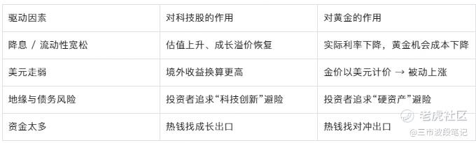 我们可以这样理解:流动性 = 同时推升科技股和黄金的“电梯电源”。一旦电源关掉(利率上升、美元转强、流动性抽走),电梯就会各自往不同方向走。