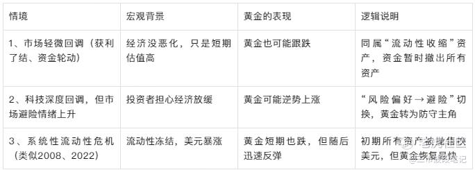 也就是说:科技股下跌 ≠ 黄金必涨。只有当“科技下跌的原因是风险上升 +经济恶化”时,黄金才会接棒成为避险资产。如果“科技下跌的原因是流动性收紧 +利率上升”,黄金也会被连带下杀。
