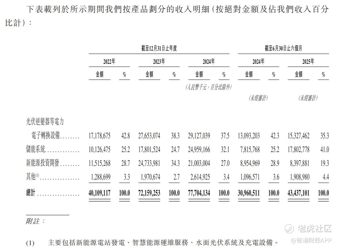 智通财经APP了解到,阳光电源成立于1997年,从光伏逆变器业务起步,逐步布局覆盖“光风储电氢”五大赛道,目前主要有三大核心业务,包括电子电力转换设备、储能系统及新能源投资开发。2025年公司上半年三大业务收入贡献分别为35.3%、41%及19.3%,另外,该公司还有智慧能源运维服务等其他产品,收入贡献4.4%。