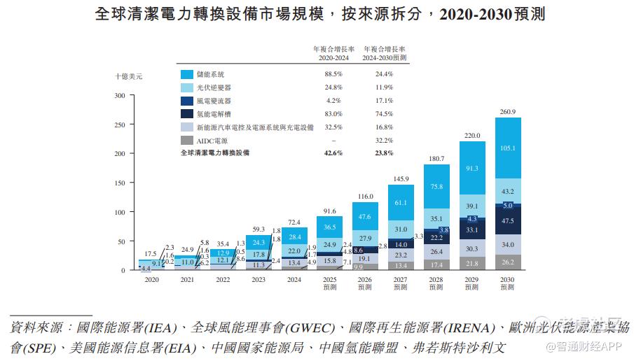 从行业来看,在全球低碳目标和能源结构调整的推动下,全球清洁电力转换设备市场规模保持高增长态势,2024年市场规模724亿美元,近五年复合增速42.6%,预计到2030年将达到2609亿元,复合增速23.8%。这得益于全球光伏新增装机容量持续保持增长态势,近五年复合增速达到37.2%。