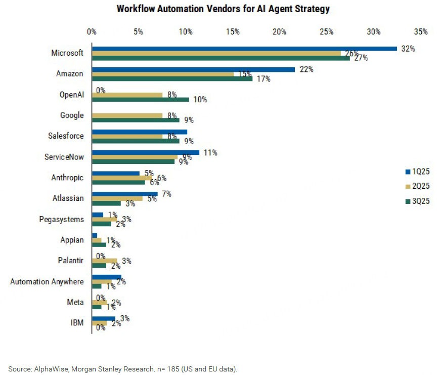 此外,微软在GenAI代理策略中的渗透率高达27%,亚马逊17%,OpenAI仅10%,谷歌、Salesforce和ServiceNow等则形成长尾。这意味着微软不只在基础设施层领先,还在应用层构建“AI代理”生态,推动自动化转型。