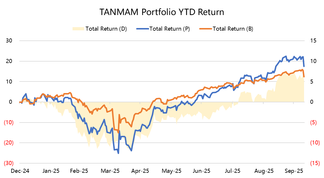 七巨头(Magnificent Seven)组成一个投资组合(“TANMAMG”组合),等权重、每季度重新调整权重。回测结果从2015年以来表现是远超 $标普500(.SPX)$ 的,总回报达到了2915.53%,同期 $标普500ETF(SPY)$ 回报282.01%,超额收益2633.52%,仍然在高位。