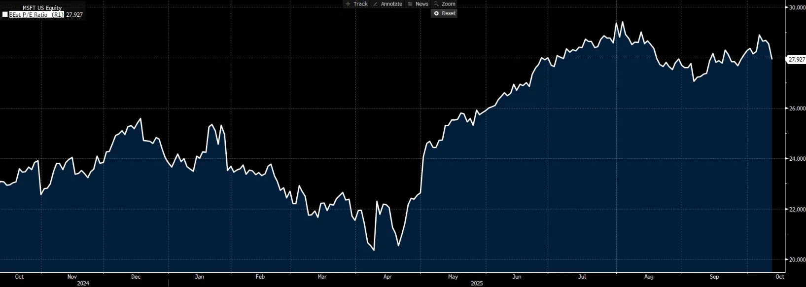最后,从估值层面看,目前微软以33x的NTM预期市盈率交易,与大盘整体的non-GAAP平均持平;按照2027年的$19.73 GAAP EPS来算,目前仅为28x倍,意味着未来一年仍有上行空间。
