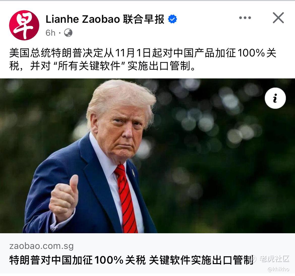 特朗普宣布将从2025年11月1日起对所有中国进口商品加征100%关税,并对所有关键软件实施出口管制,此举是对中国加强稀土出口管制的回应。这一消息在美股市场引发了剧烈震荡。看,又是关税,每次都是拿关税来说事。[捂脸]